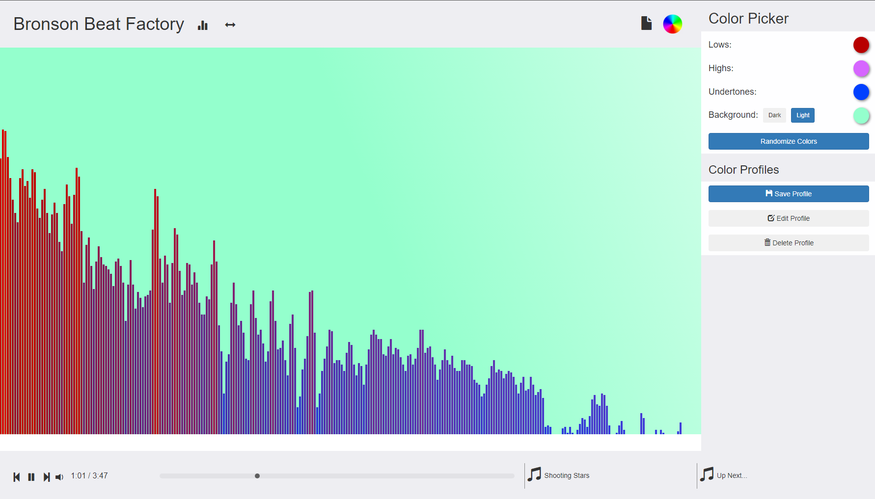 An online audio visualizer app. Takes any mp3 file as input and modifies an HTML canvas with frequency buckets from an FFT function to display frequency magnitudes. Includes audio controls and customizable colours!