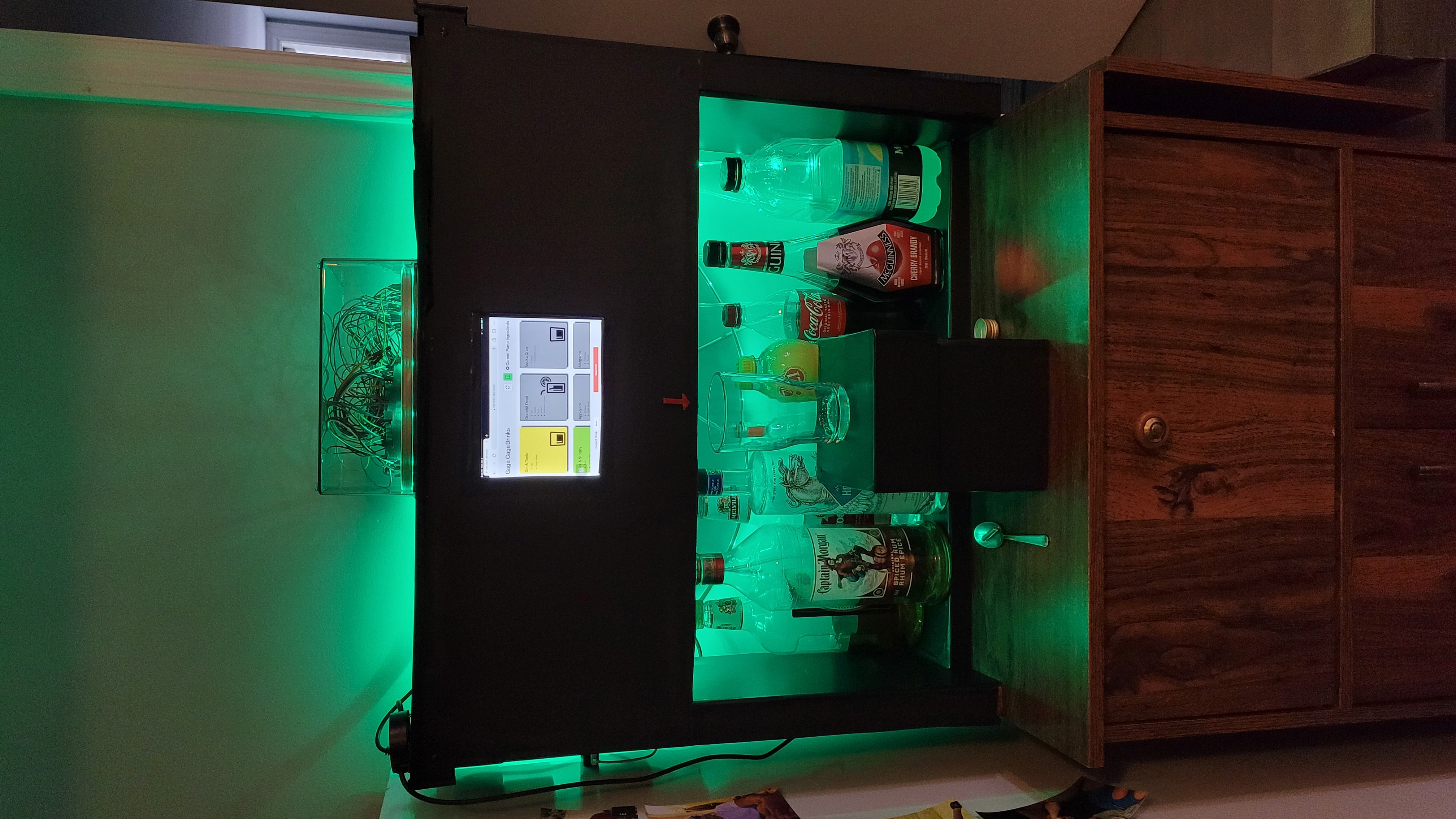 An automatic bartender machine I made with my roommates. A website hosted on a raspberry pi is told which drink ingredients are loaded into the machine, the machine will then display the available cocktails. Pumps are controlled by the pi to dispense the correct amount of each ingredient. Even has a magnetic stir stick for mixing the drinks once poured.